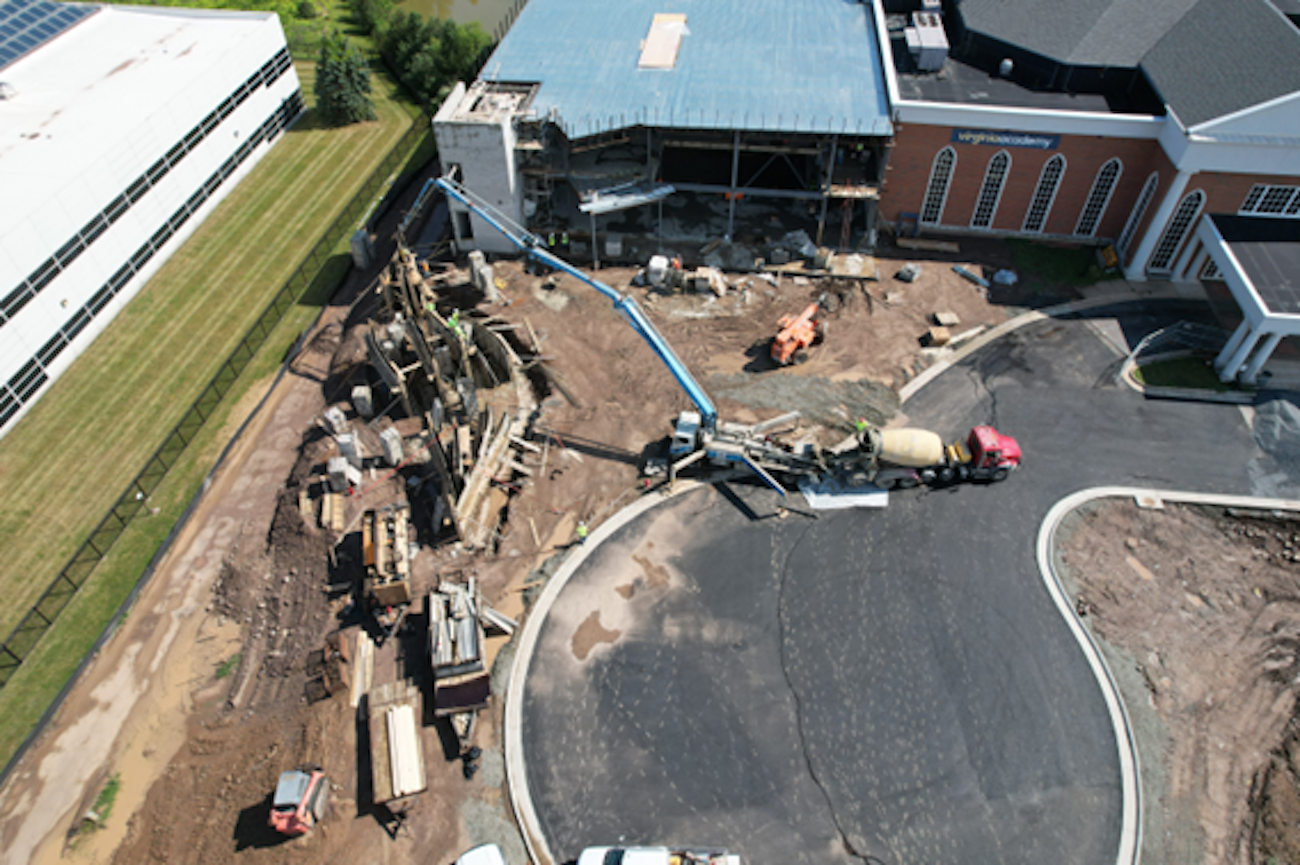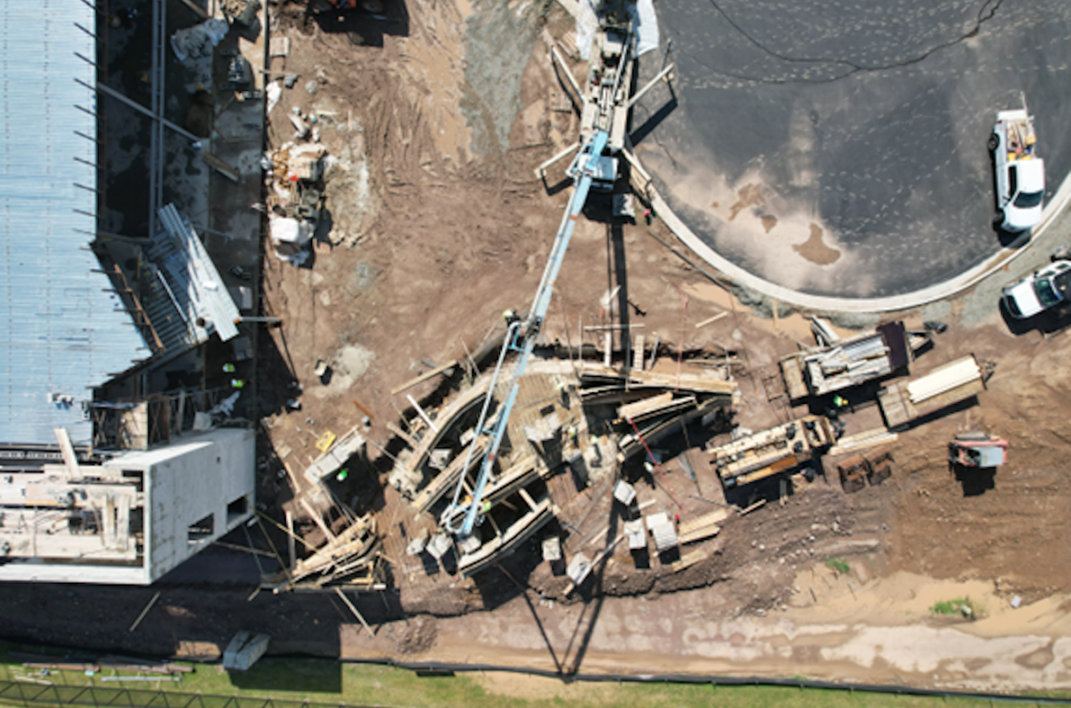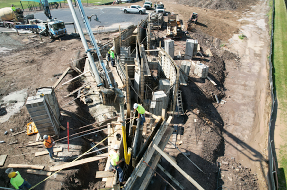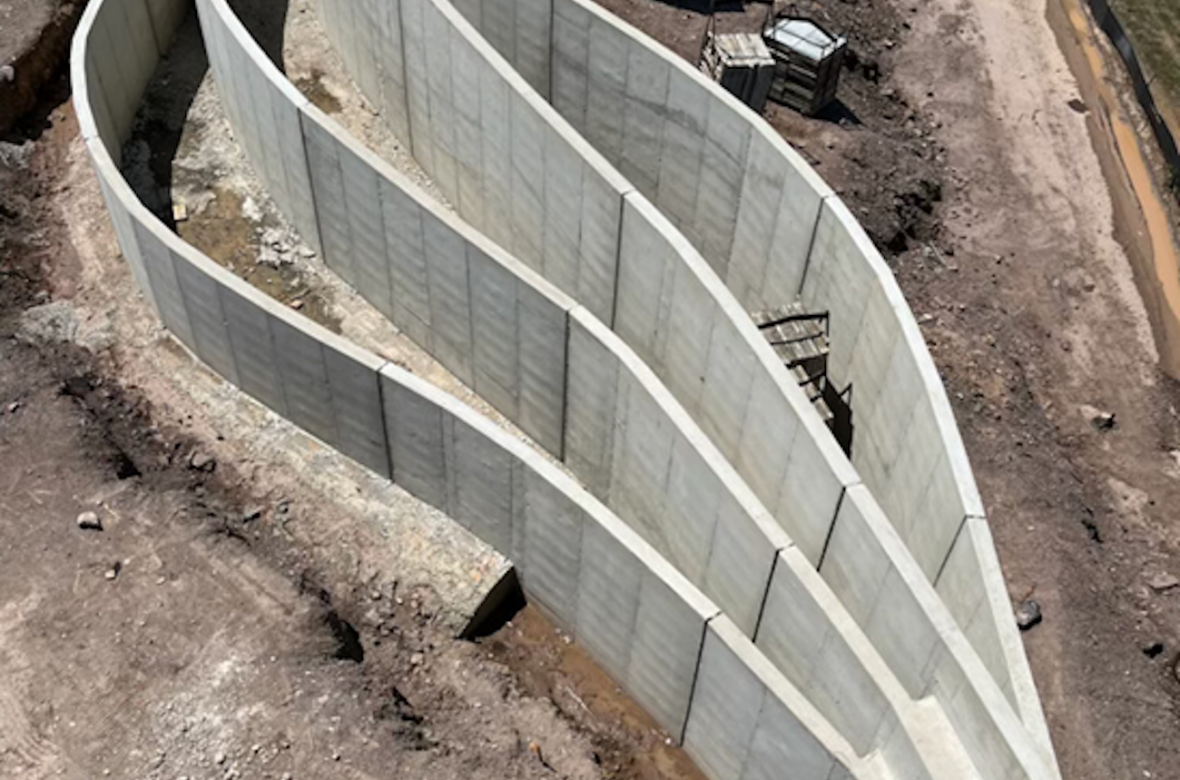 Multi-layered, curved concrete walls that intersect at various heights making precision difficult but necessary